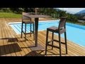 Table with rattan leg and painted aluminium base. Werzalit tops resistant to outdoor use. Available in dark grey, brown and white colors. Can be disassembled.